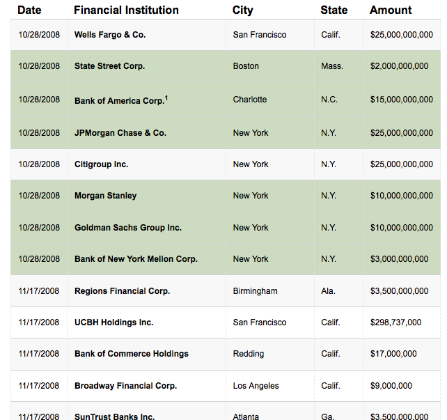Below, via CNN, is a list of the top banks who received billion-dollar bailouts in 2008, and who paid that money back (highlighted in green):