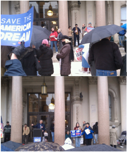More disturbing, though, was the bizarre relationship the rally leaders had with Occupy Trenton – a mix of disregard and exploitation. The Occupiers, only a handful of long-term campers, watched from across the street (one asked me where I’d come from, baffled the rally was even talking place), another encampment was said to be left alone five blocks away, and then a purported Occupy Trenton spokesperson got in on the MoveOn fun, concluding the series of speakers with an elegantly vague rant that lamented all of our problems while holding no one accountable. This is What Co-opting Looks Like.