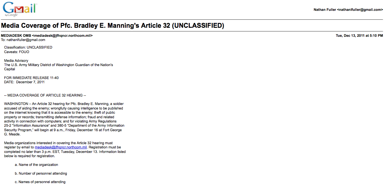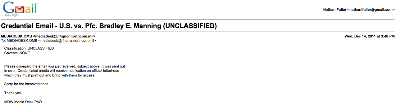 On Wednesday, December 14, at 3:35 PM, Fort Meade’s Media Desk sent me this email, entitled “Credential Email – U.S. vs. Pfc. Bradley E. Manning (UNCLASSIFIED).” In the first section, the second sentence reads, “You are now officially credentialed to cover this hearing.”