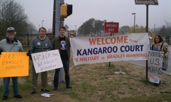 This Thursday and Friday, March 15 & 16, I attended Bradley Manning’s motion hearing at Ft. Meade, MD. We held vigils outside the gate before the hearings began both days, and several supporters came inside the courtroom to show solidarity with the 24-year-old whistle-blower.