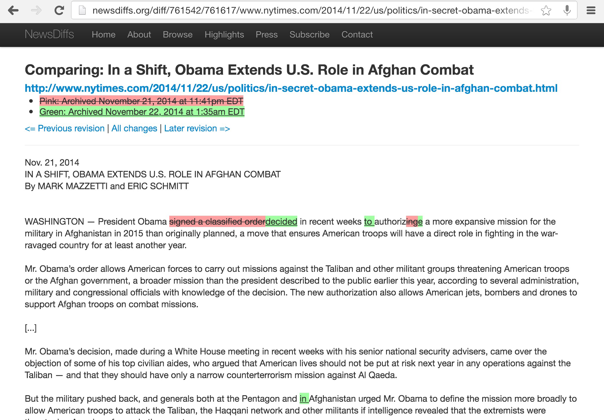 When asked on Twitter to explain the changes, Mazzetti said (in two tweets), “after story posted we continued reporting, and became less certain Obama actually “signed” something so we reverted to language we knew absolutely to be true.”