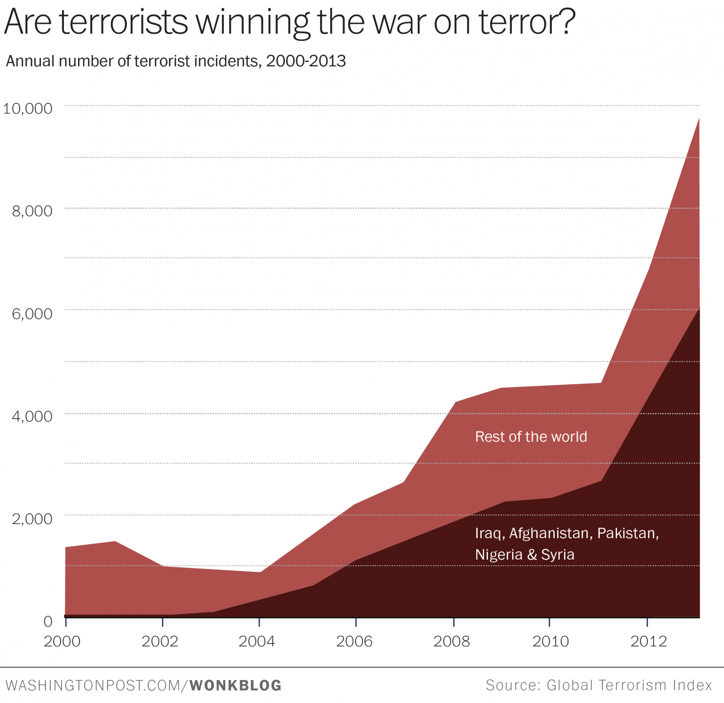 The major stated goal, though, is counterterrorism, and US stated goals and reality don’t match up yet again. The Washington Post reports that “terrorist attacks are rising sharply”: